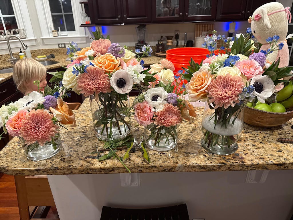 Re-cut and Space: Give your flowers another fresh cut and place them in your prepared buckets. You may need to spread your stems out into more buckets to give them even more room to bloom. It is important not to overcrowd your buckets. Allow your flowers to continue to hydrate for another 8 hours before beginning the design process.