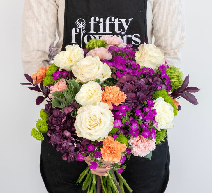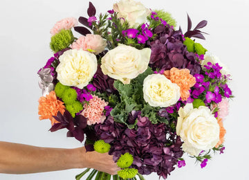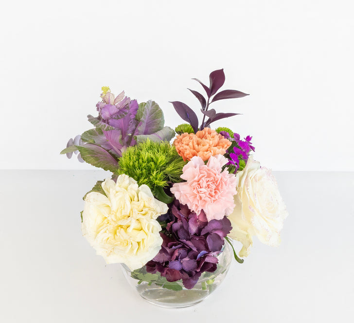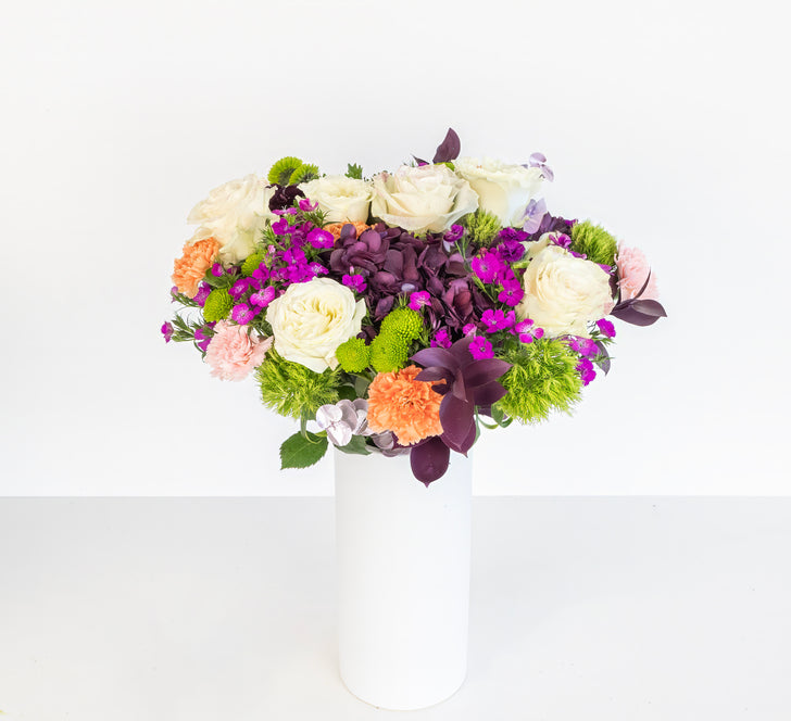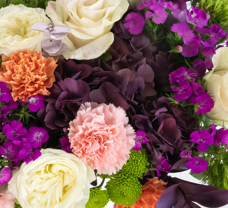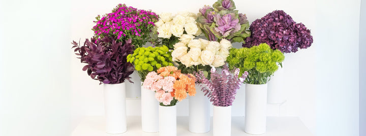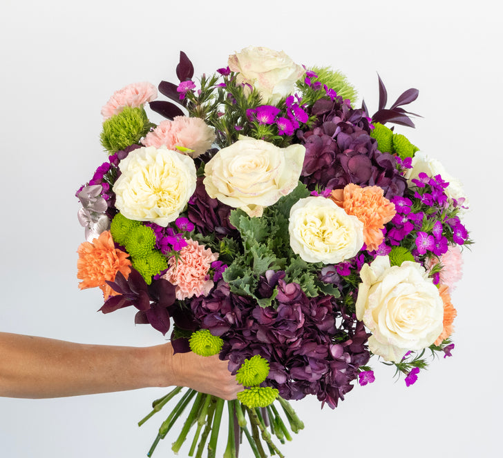 The Aura Beauty Flower Collection blends deep purples, creamy whites, fresh greens, and pops of peach in a vibrant, enchanting palette. With roses, hydrangeas, bicolor kale, and playful textures, this collection delivers modern contrast with a touch of magic. A bold, expressive choice for weddings, creative floral designs, or any moment that calls for standout color and style.