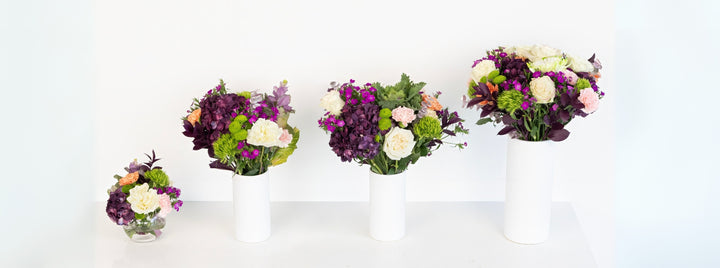 Available in Mini, Small, Medium, and Large sizes, our carefully curated preassembled flower centerpieces make setup easy. Simply trim the stems, place them in your favorite vase, and arrange them throughout your event space!