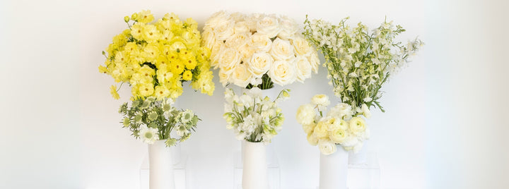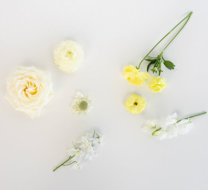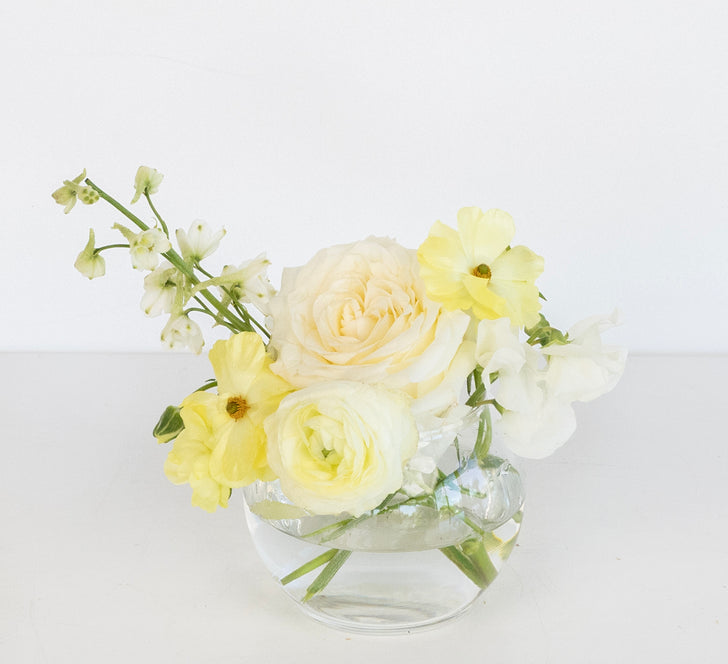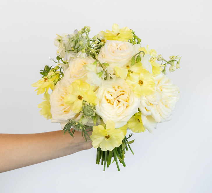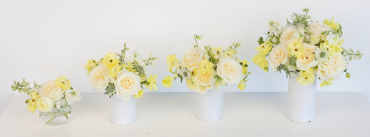 Our Butter Yellow Flower Collection feature cheerful and romantic arrangements that radiate warmth and charm. Featuring soft yellow roses, delicate ranunculus, airy sweet peas, butterfly ranunculus, textured scabiosa, and wisps of pastel delphinium, this collection blends creamy tones with fresh floral movement.