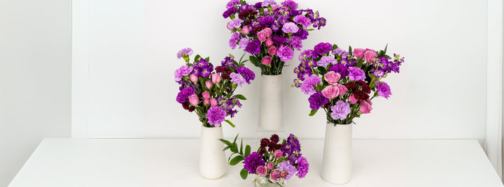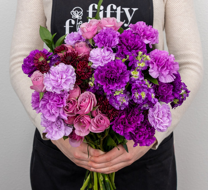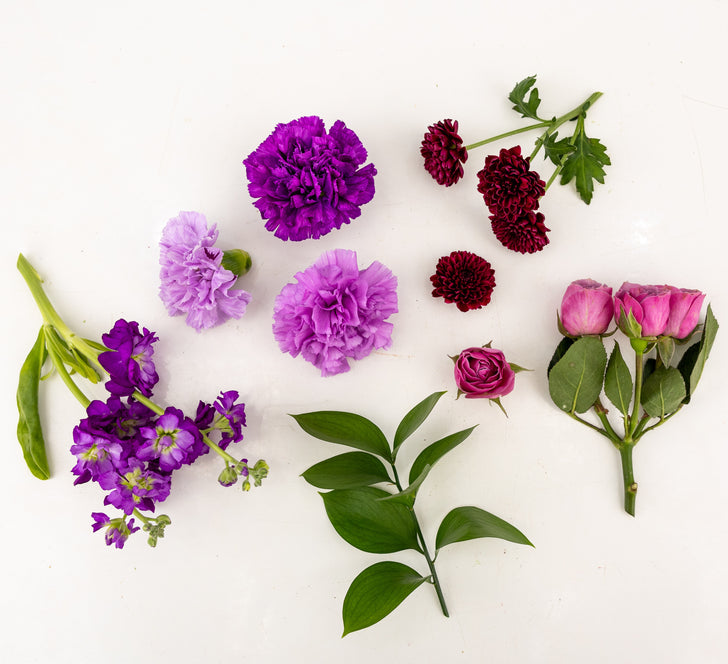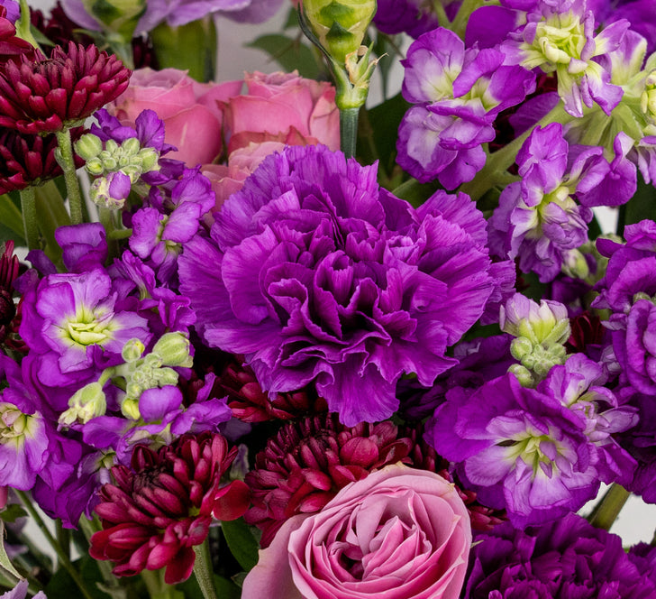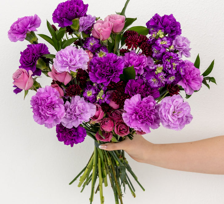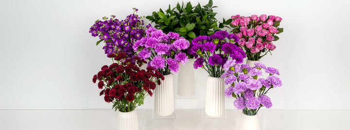 The Shades of Purple Flower Collection beautifully showcases a vibrant palette of purple hues. Featuring a stunning mix of rich purple carnations, soft lavender poms, purple spray roses, and lush greenery, these bulk flowers provide a striking contrast of colors and textures.