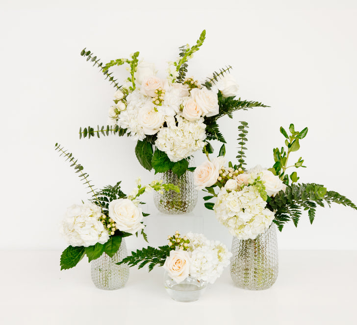 Available in Mini, Small, Medium, and Large sizes, our carefully curated preassembled flower centerpieces make setup easy. Simply trim the stems, place them in your favorite vase, and arrange them throughout your event space!