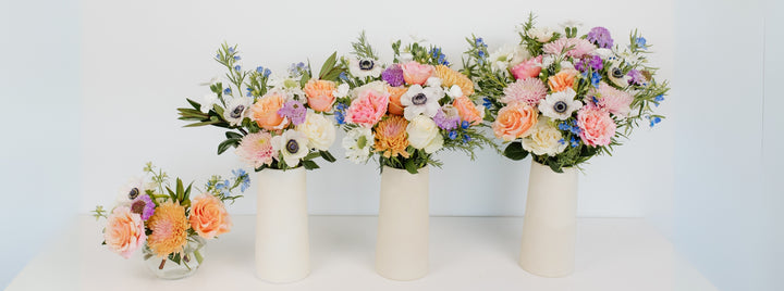 Available in Mini, Small, Medium, and Large sizes, our carefully curated preassembled flower centerpieces make setup easy. Simply trim the stems, place them in your favorite vase, and arrange them throughout your event space!