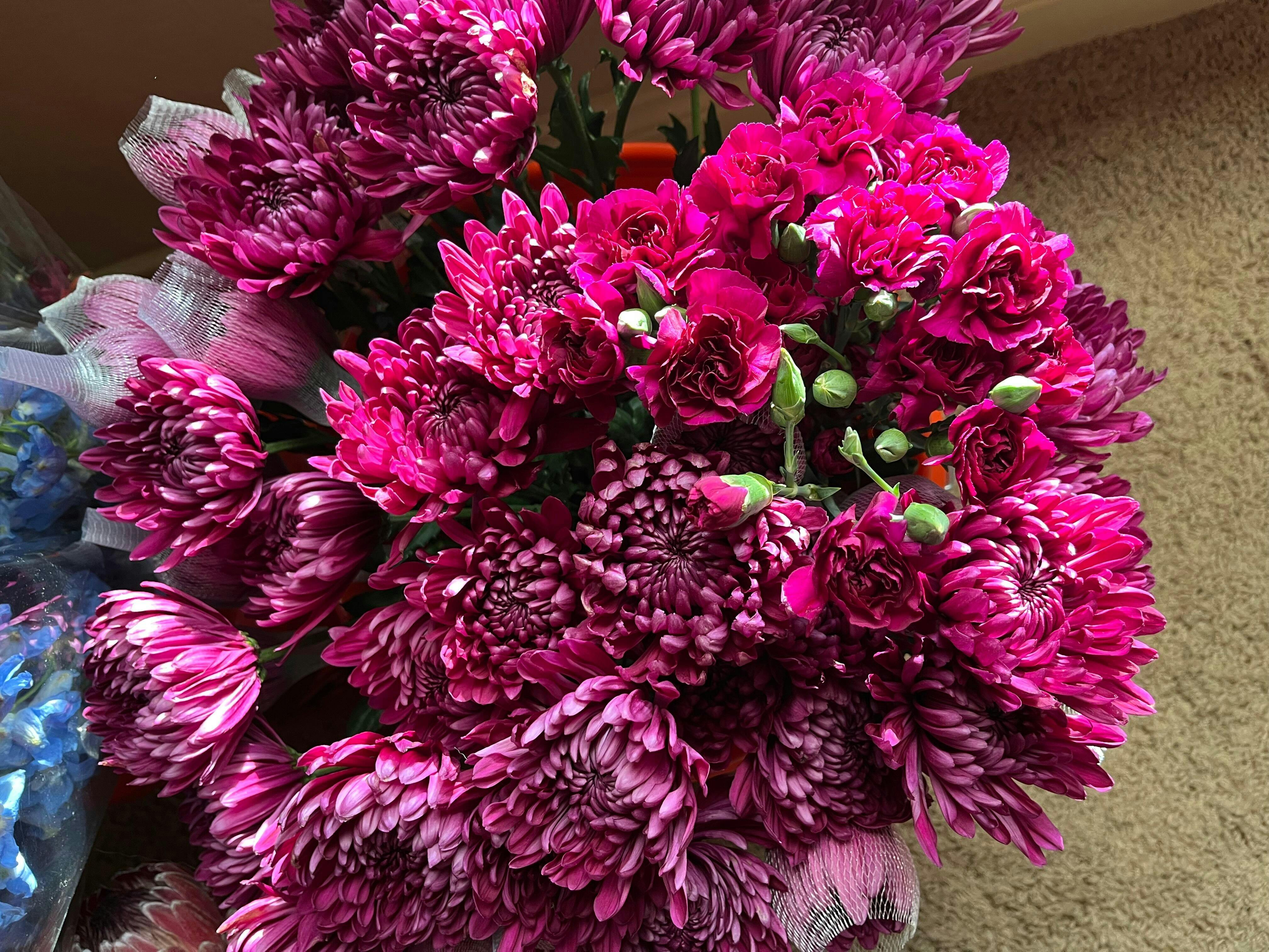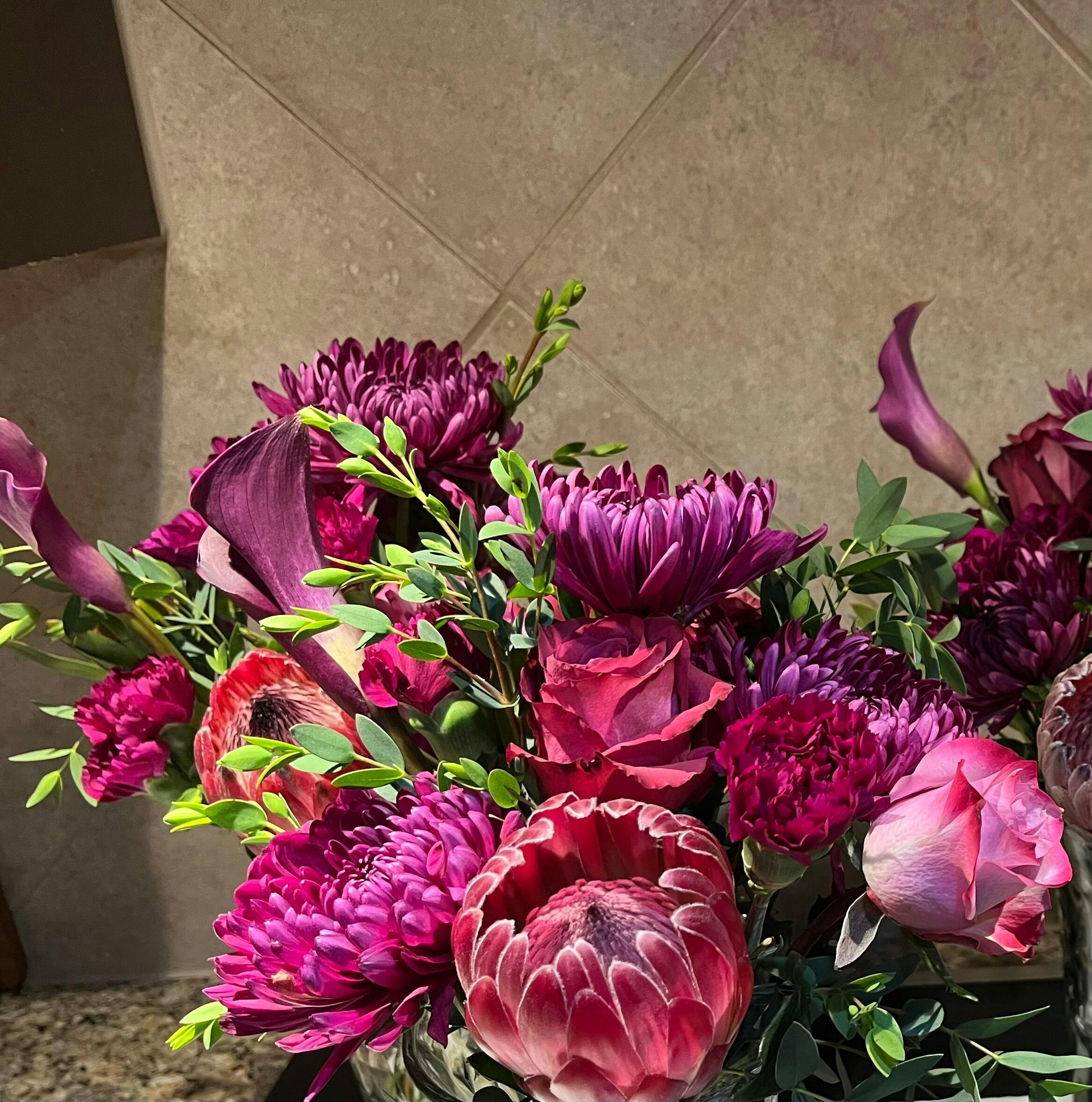 Hi Laura! Thank you for the lovely review! We are so happy to hear that you had a great experience with our Purpleberry Cremon Mum Flower. We take pride in providing the best customer service and communication. It's great to know that our packaging and sturdy flowers were able to make your arrangement even more unique. Thank you for sharing pictures of the final look! We love it.