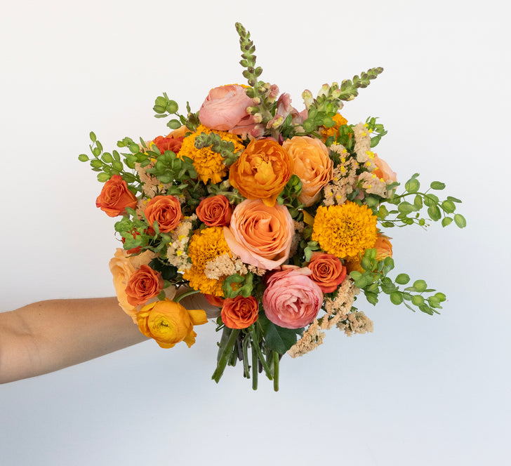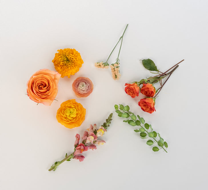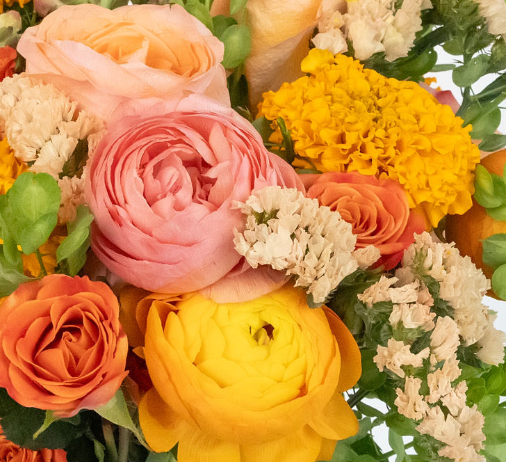 Add instant charm to your table with the Citrus Punch Flower Collection. Featuring marigolds, peach and spray roses, ranunculus, snapdragons, statice, and lush greens, this flower collection showcases a striking color palette of peach, coral, and warm orange hues, balanced with soft blush and bright golden accents.