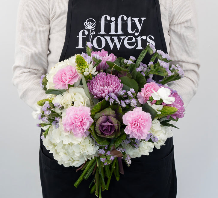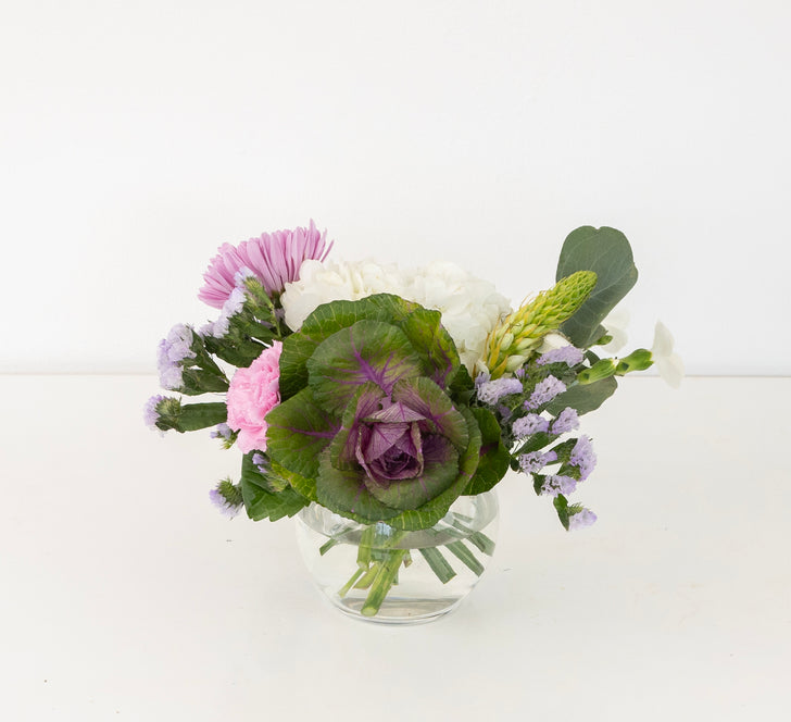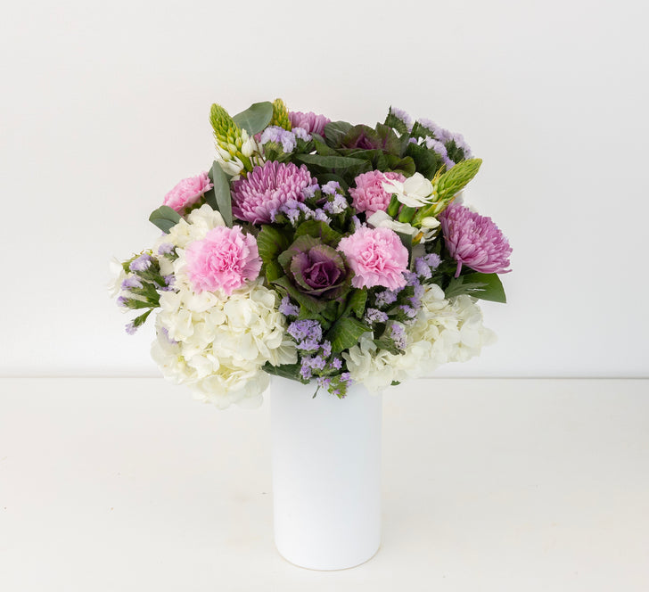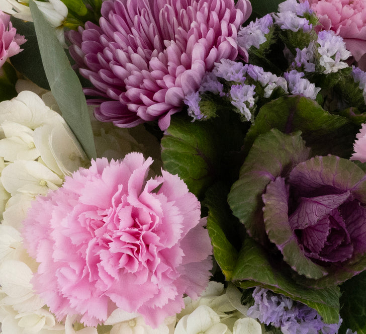 Kale Garden Flower Collection brings a soft, garden-fresh touch to any event. Featuring lush pink disbud chrysanthemums, lavender statice, white solomio, lavender carnations, purple kale and airy eucalyptus, this collection offers the perfect mix of texture and color. Ideal for bridal showers or garden parties, it lets guests design their own charming spring-inspired arrangements filled with natural beauty and romantic whimsy.