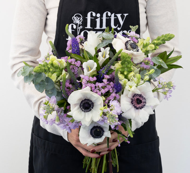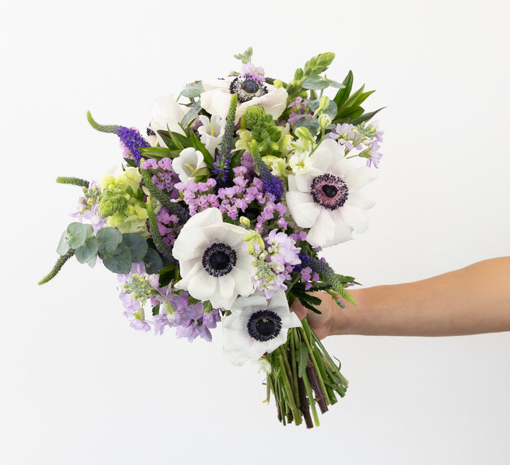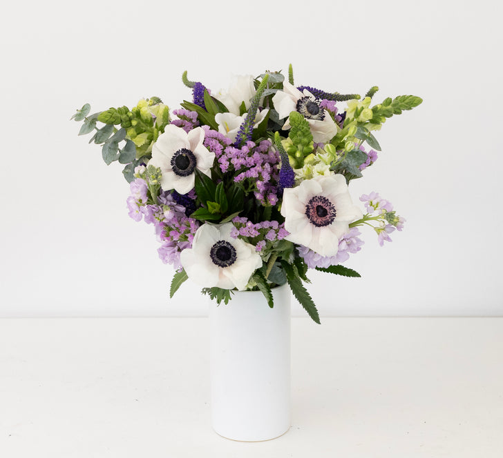 Set the scene for spring gatherings with the Lavender Dreams Flower Collection, thoughtfully arranged with lavender stock, white snapdragons, white anemones, lisianthus, statice, eucalyptus, and hebes. These ready-to-use florals are perfect for weddings, brunches, or garden parties, offering a soft, airy look that enhances any table.