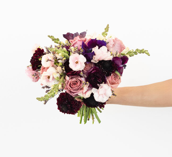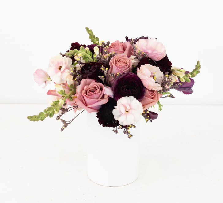 The Moody Mauve Flower Collection is ideal for anyone who wants to bring a touch of modern romance into their space. With layers of mauve roses, burgundy ranunculus, burgundy anemone, and soft pink blooms.