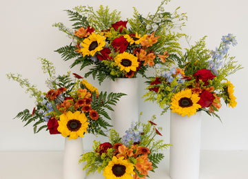 Available in Mini, Small, Medium, and Large sizes, our carefully curated preassembled flower centerpieces make setup easy. Simply trim the stems, place them in your favorite vase, and arrange them throughout your event space!