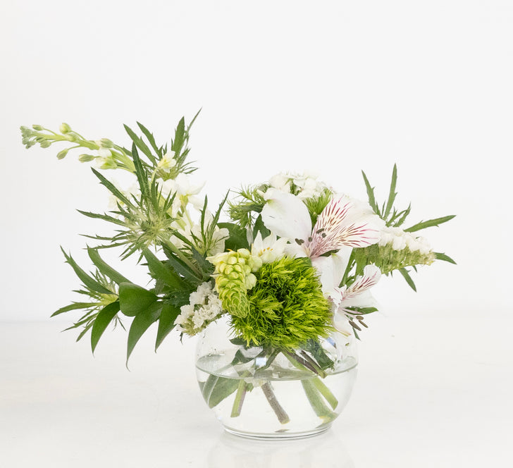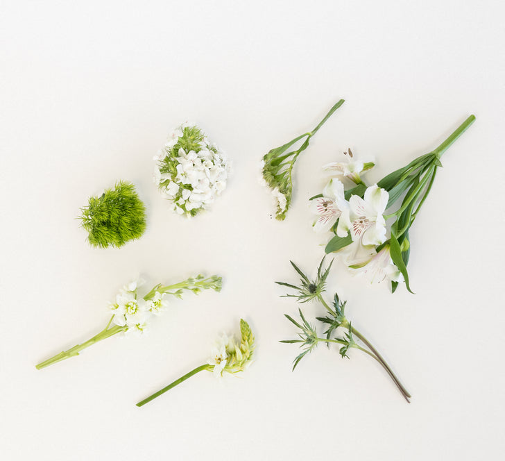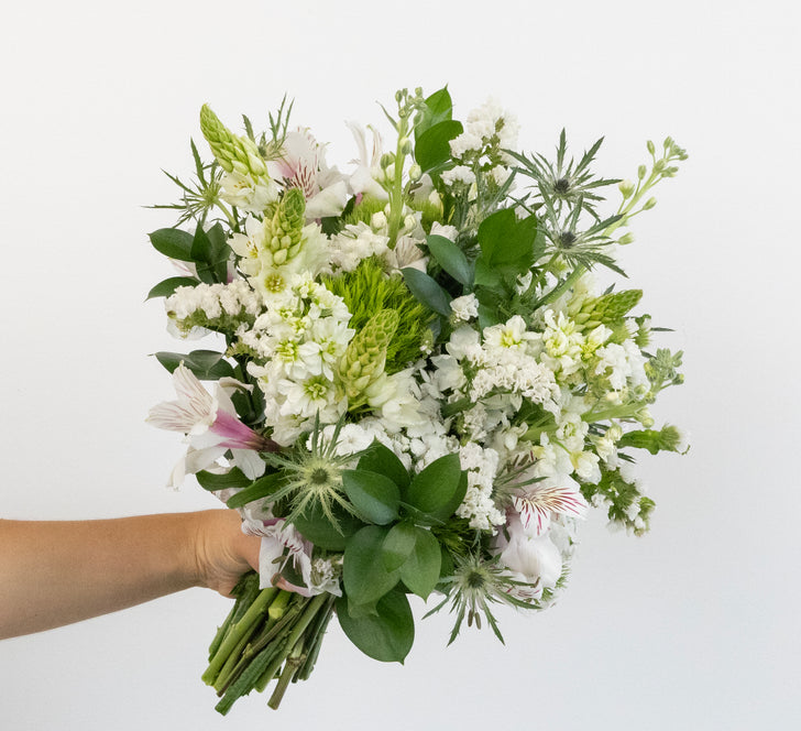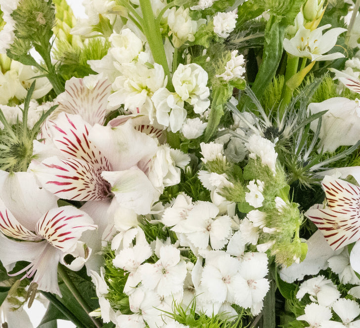 White Blooming Flower Collection features a curated selection of elegant white blooms and lush greenery, designed to inspire creativity and bring a touch of sophistication to any space. This collection includes White Stock, Alstroemeria, Star of Bethlehem, Green Trick Dianthus, and Thistle, offering a mix of textures, shapes, and sizes that make each arrangement unique. Perfect for creating stunning bouquets, centerpieces, boutonnieres, or decorative accents, these fresh flowers allow you to craft personalized designs for weddings, events, or home decor.