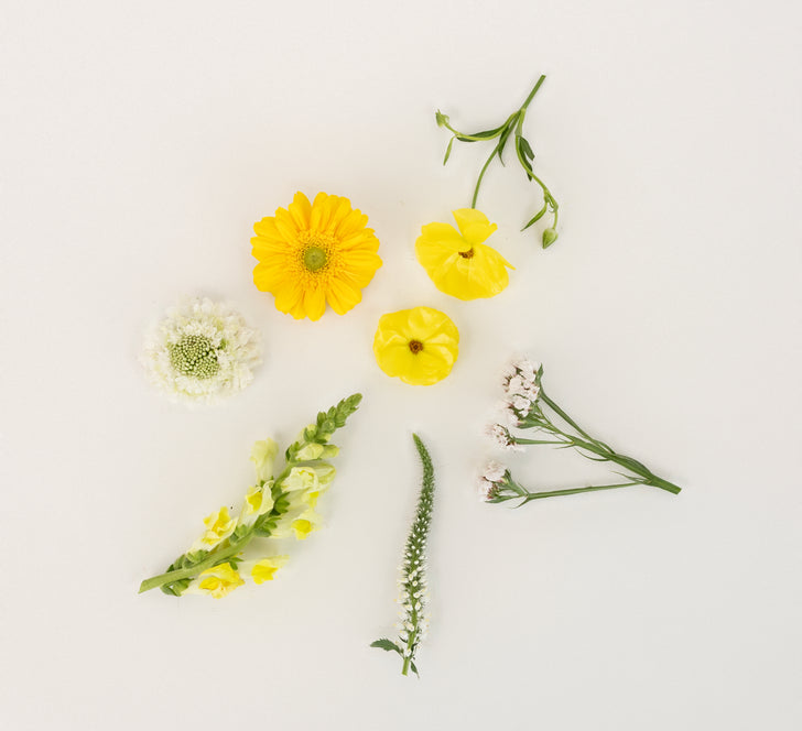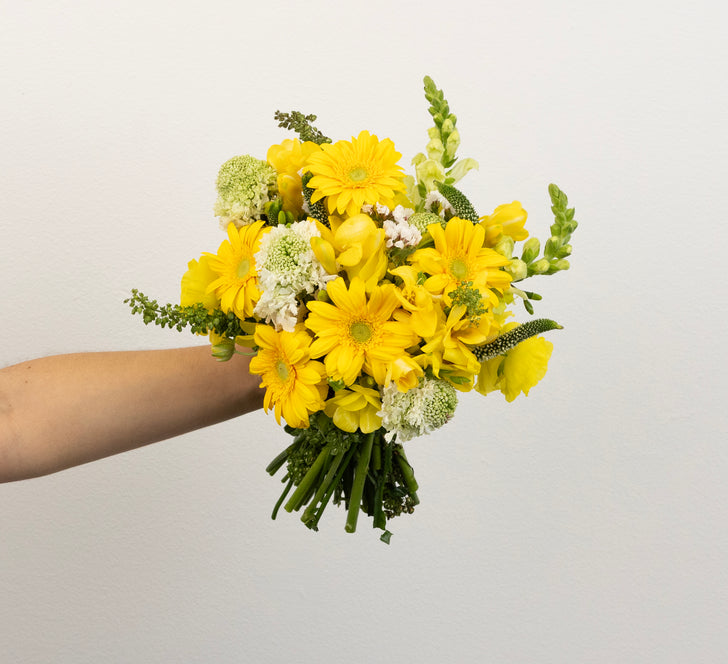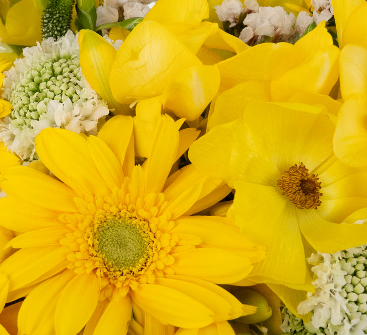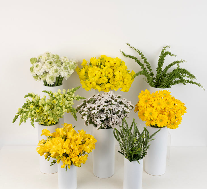 The Yellow and White Sunshine Flower Collection is a joyful floral assortment filled with radiant yellow and soft white blooms. Featuring cheerful gerbera daisies, yellow butterfly ranunculus, yellow freesia, white scabiosa, white veronica, yellow snapdragon, and fresh greenery, this collection brings a bright, uplifting look to any setting. Perfect for weddings, bridal showers, baby showers, corporate events, and celebrations where fresh, sunny florals create a welcoming atmosphere.