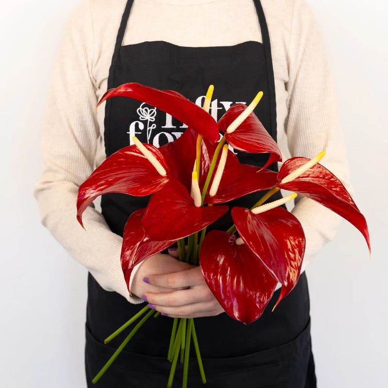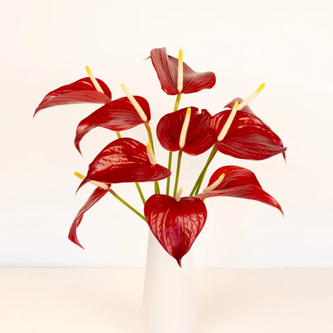 Designer Decadent Red Anthurium Flowers feature leaf-like tulip shaped blooms in a vibrant red, ideal for eye catching tropical flower arrangements. Wholesale pricing and bulk bunches helps cut costs on your floral arrangements for any event. Use multiple stems to create a dreamy tropical table arrangement or a single stem as a standalone statement centerpiece. Pair your Anthurium with a Orlaya White Lace Vintage Wedding Flower and Monstera Leaves Tropical Green for a gorgeous arrangement. Shipped directly from our farms to your doorstep.