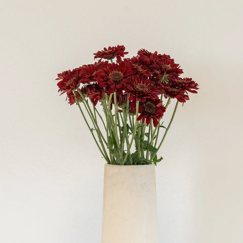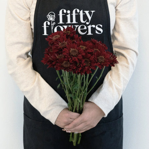 Fall Red Pom Flower is a unique spray flower in the Pompom family. A classic daisy bloom, the Fall Red Daisy Flower flower has dark red petals with a center that is dusted in light yellow. This unique red daisy would add an alluring appeal to any wedding bouquet, table centerpiece or flower arrangement.