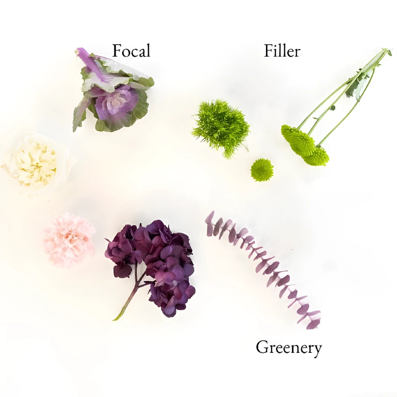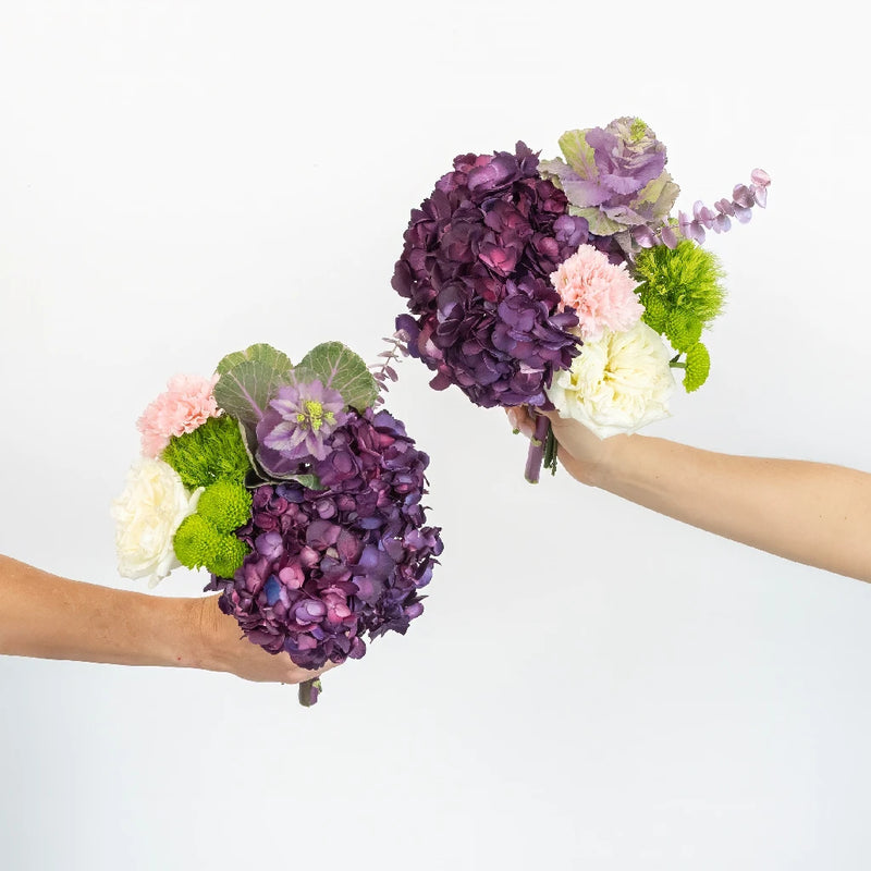 Suggested Flower Recipe For One Bouquet: 1 purple kale, 1 tinted purple hydrangea, 1 white/cream garden roses, 1 pink carnations, 1 green trick dianthus, 1 green buttons, and 1 tinted pink baby eucalyptus.