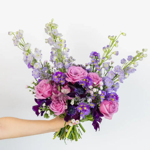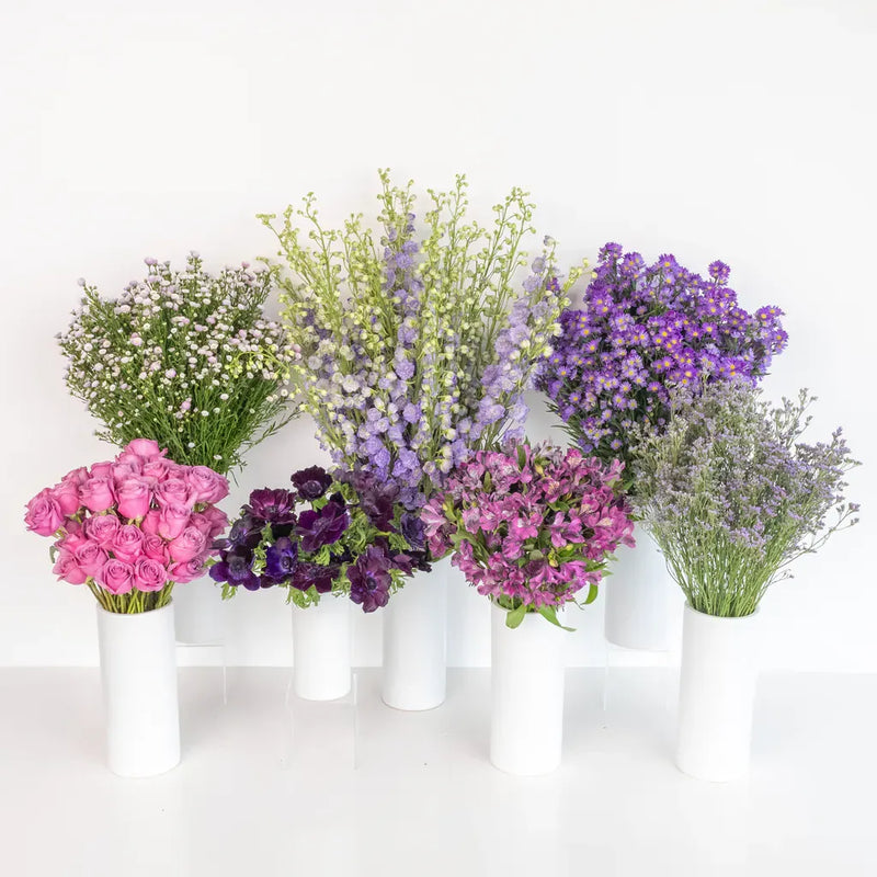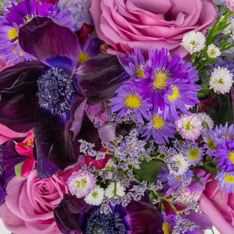 This DIY Flower Kit features growers bunches of purple anemones, lavender roses, violet purple asters, purple alstroemeria, purple limonium, petite pink asters, and lavender delphinium.