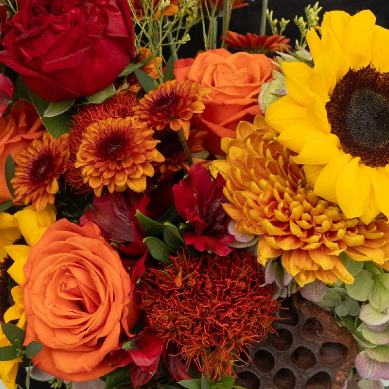 Each centerpiece features a harmoniously hand-crafted arrangement of orange roses, yellow sunflower, red garden rose, bronze football mum, bronze pom, antique green hydrangea, tinted orange ball dianthus, yellow limonium, brown lotus pod, red alstroemeria, and parvifolia eucalyptus.