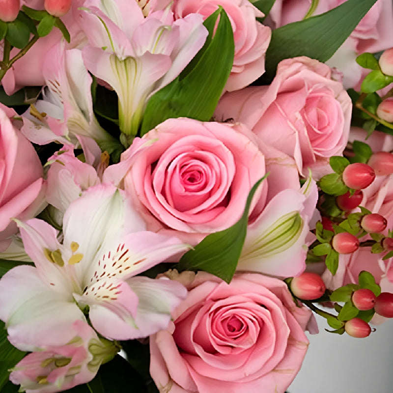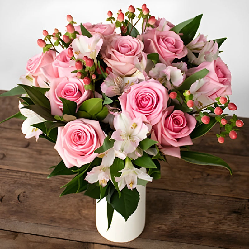 Our Beautiful Pink Rose Flower Arrangements display some of our most beautiful pink flowers. With light pink roses, light pink alstroemeria, and pink hypericum berries on a backdrop of dark cocculus greenery, this arrangement is a perfect embodiment of the friendship and love that these pink flowers symbolically represent. These soft pink colors are reminiscent of innocent love, cherishing your friends and sweethearts, and letting joy and optimism into your life.