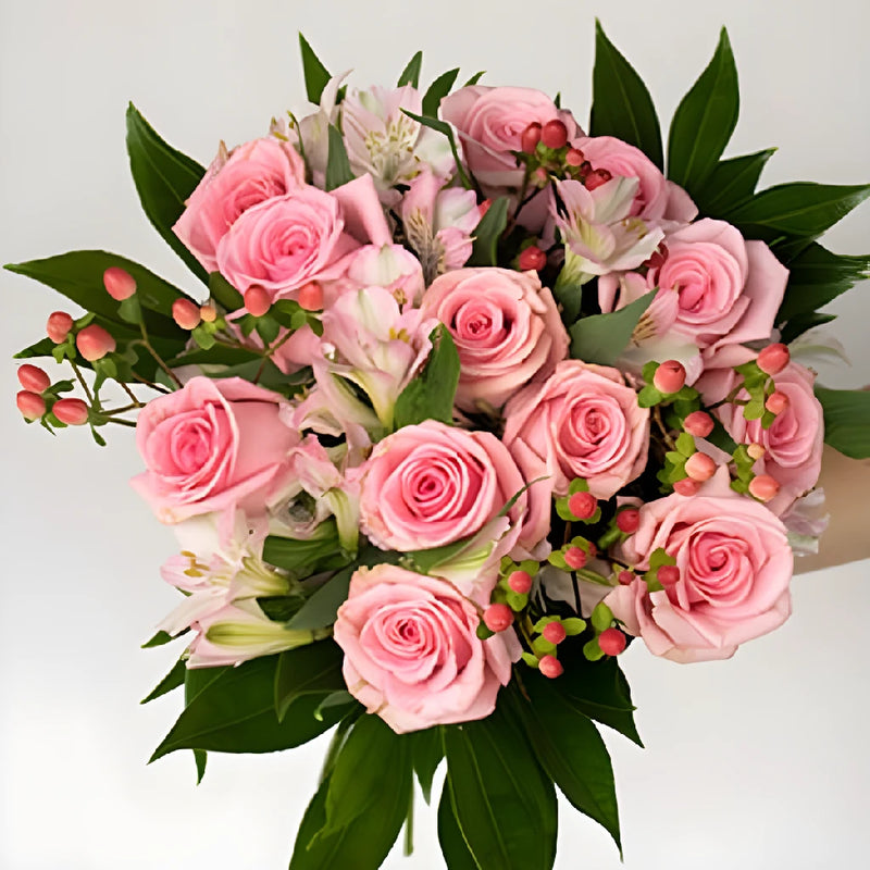 Each bouquet features a harmoniously hand-crafted arrangement of roses, alstromerias, and hypericum berries.