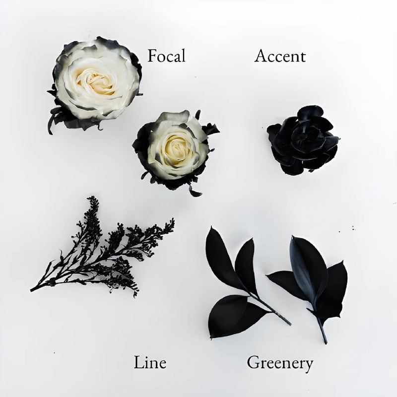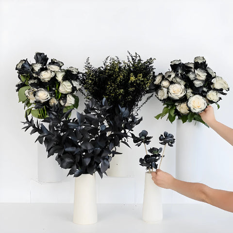 Suggested Flower Recipe For One Bouquet: 2 black roses, 1 black solidago, 2 black ruscus and 1 succulent.