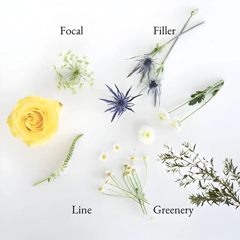 This Flower Bar Kit features growers bunches of yellow rose, white queen anne's lace, white feverfew, white pompom buttons, blue thistle, white veronica, and parvifolia eucalyptus.