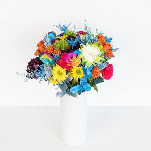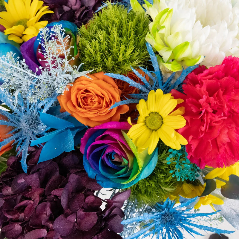 Each bouquet features a harmoniously hand-crafted arrangement of rainbow roses, purple hydrangea, white tinted green cremon, hot pink carnation, orange spray rose, blue glittered thistle, green trick dianthus, yellow daisy, teal and light blue lepidium, blue glittered ruscus, and metallic light blue ruscus.