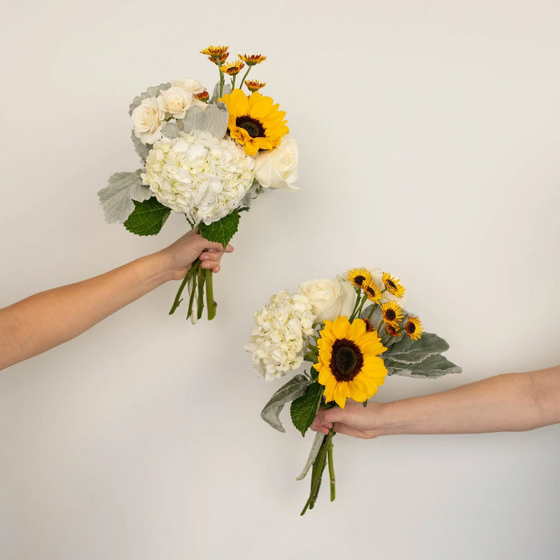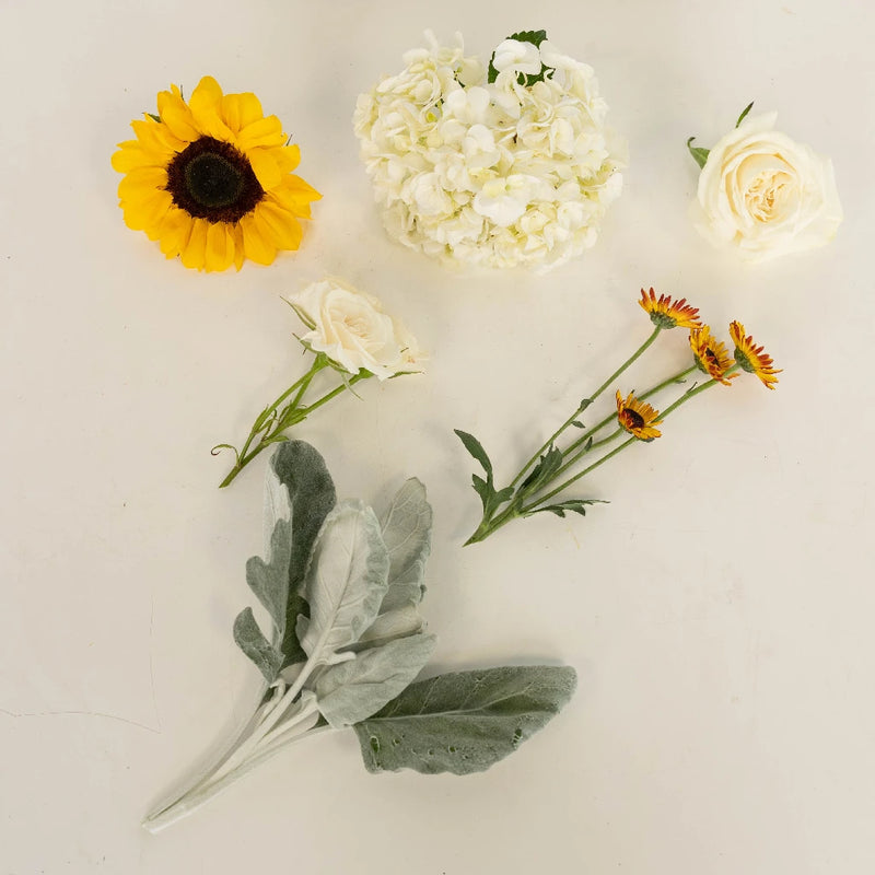 Suggested Flower Recipe For One Bouquet: 1 white hydrangeas, 1 sunflowers, 1 white roses, 1 yellow novelty poms, 1 white spray roses and 1 dusty miller.