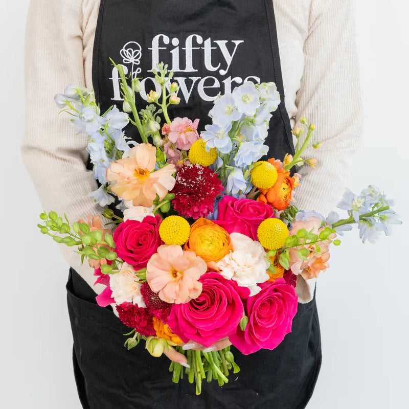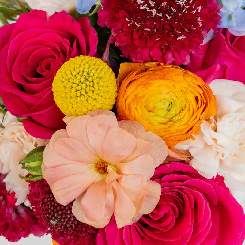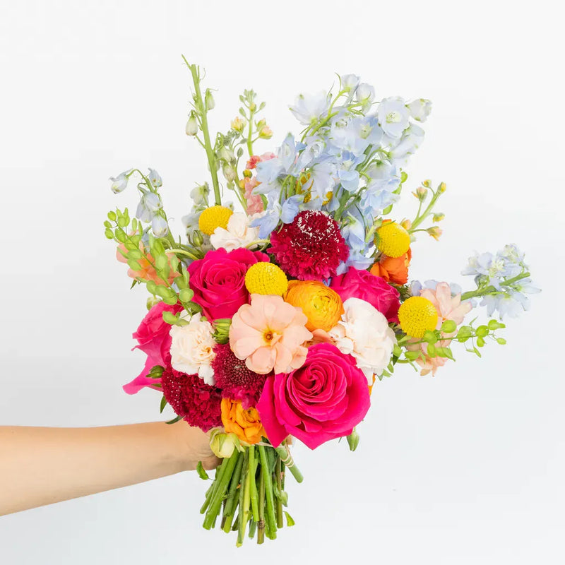 This DIY Flower Kit features growers bunches of hot pink roses, peach carnation, orange ranunculus, raspberry pink scabiosa, peachy pink butterfly ranunculus, light blue delphinium, peach stock, pennycress greenery, and yellow craspedia.