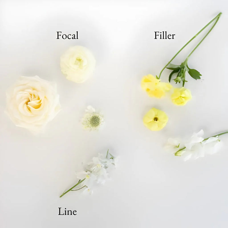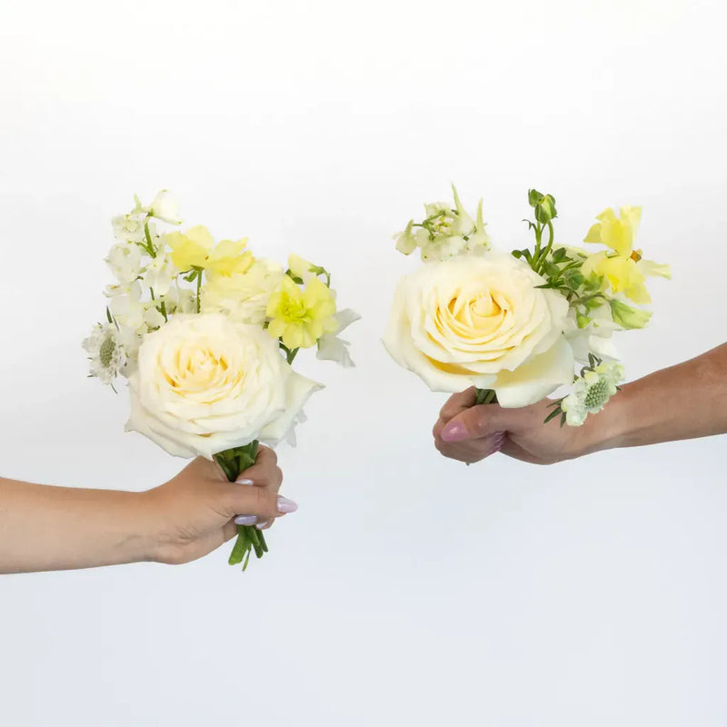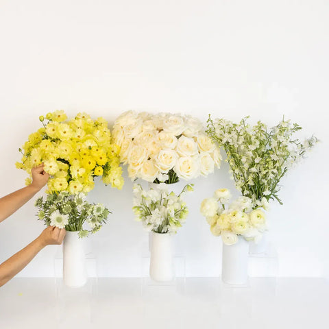 This Flower Bar Kit features growers bunches of champagne ranunculus, candlelight rose, white scabiosa, white sweet peas, pale yellow butterfly ranunculus, and white delphinium.