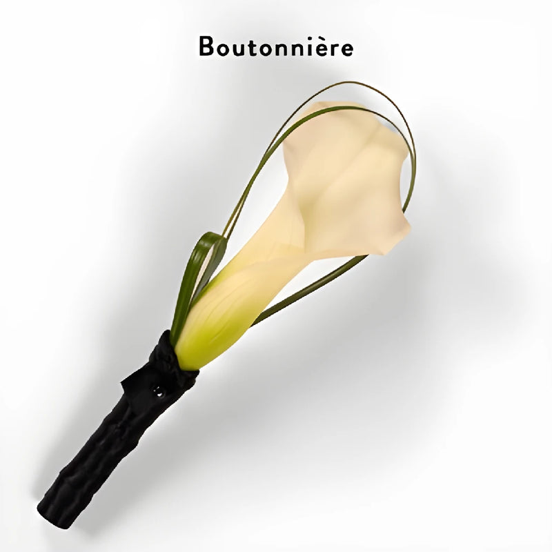 - Groom's Boutonniere features: White or Deep Purple Calla Lilies and Lily Grass.