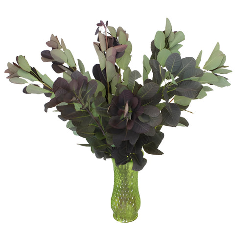 Sultry and smoky as fine wine, Cotinus Smoke Bush Wholesale Greenery adds a smoldering mystery to any elegant arrangement. Its bicolor ovular leaves feature a rich and earthy midnight purple on one side, and vivid lime-green on the other side; this creates gorgeous, glamorous contrast. For romantic and sexy arrangements, pair this steamy greenery with blooms like Blushing Bride Protea Flowers, Ranunculus Apricot Blend, Cabbage Garden Roses Romantic Antique Pink, and True White Garden Roses.