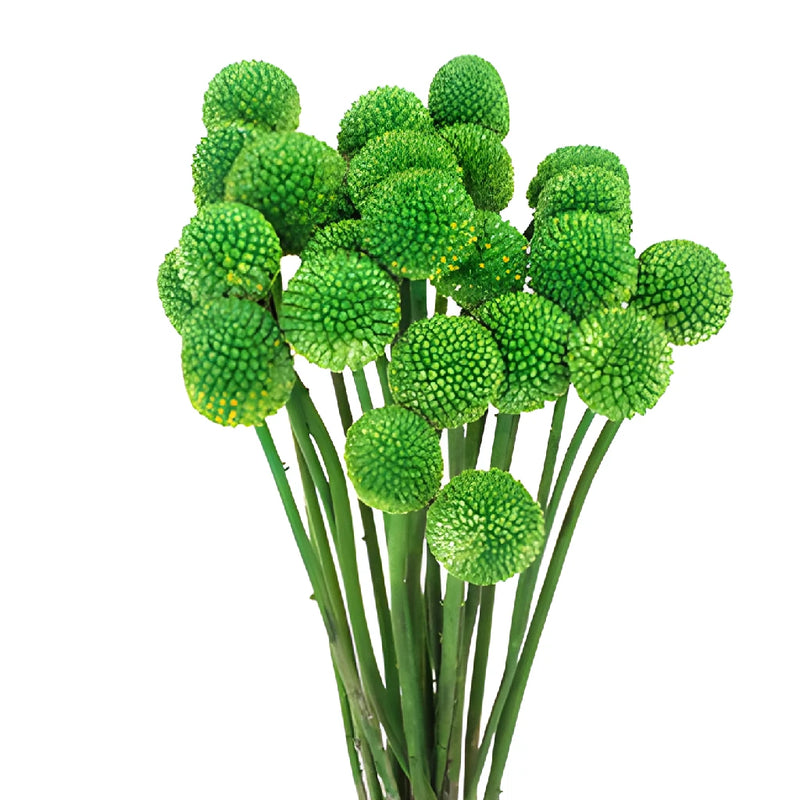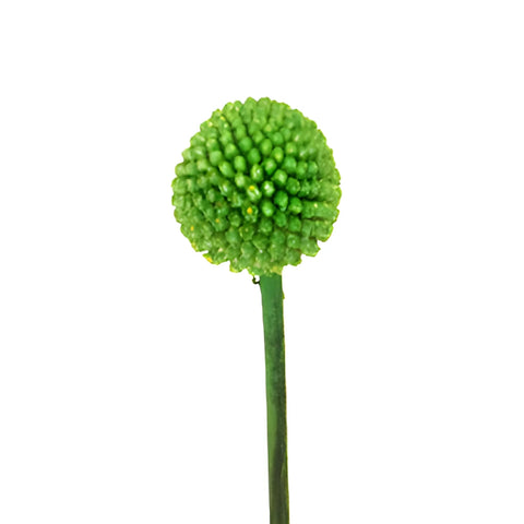 Make your event look fun and fresh with Green Tinted Craspedia Billy Balls. Billy balls have little to no foliage, as well as an impressive, globe-shaped bloom. These blooms have a unique scaly texture, and are enhanced with a vivid green hue; this makes them ideal for adding dynamic color to rustic-inspired arrangements. Pair with blooms like white hydrangea flowers, yellow butterscotch fresh cut roses, snapdragon yellow flowers, and green dianthus flowers.