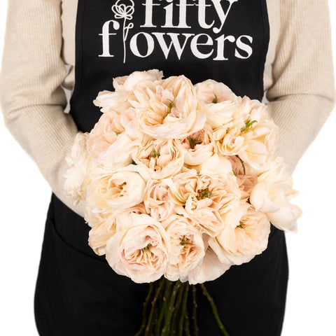 The captivating David Austin Charity Garden Rose is a twist on a classic garden rose shape. The leafy green centers are a beautiful juxtaposition to the soft full blush petals. Pair with FiftyFlower Orange Pin Cushion flowers and White Anemones for a unique bridal bouquet or use with Soft Pink Ohara Garden Roses for a twist on a monochromatic arrangement.