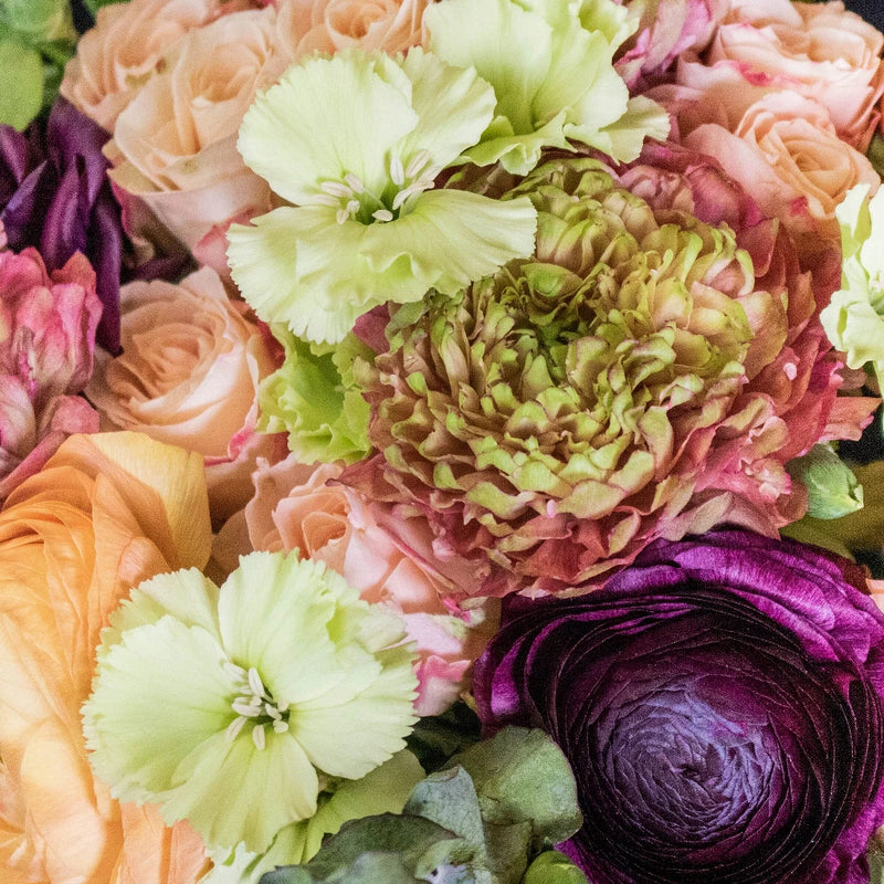 This DIY Flower Kit features growers bunches of peach ranunculus, burgundy ranunculus, pink/green pon pon ranunculus, green solomio, peach spray roses, and baby blue eucalyptus.