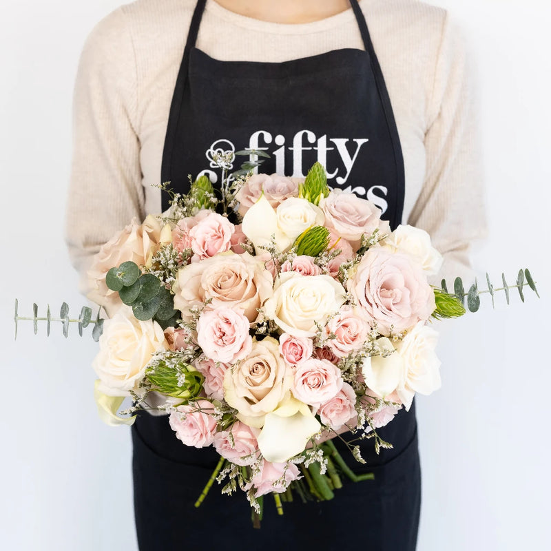 This DIY Flower Kit features growers bunches of vendela rose, quicksand rose, light pink spray rose, white calla lily, white limonium, white ornithogalum, and eucalyptus baby.