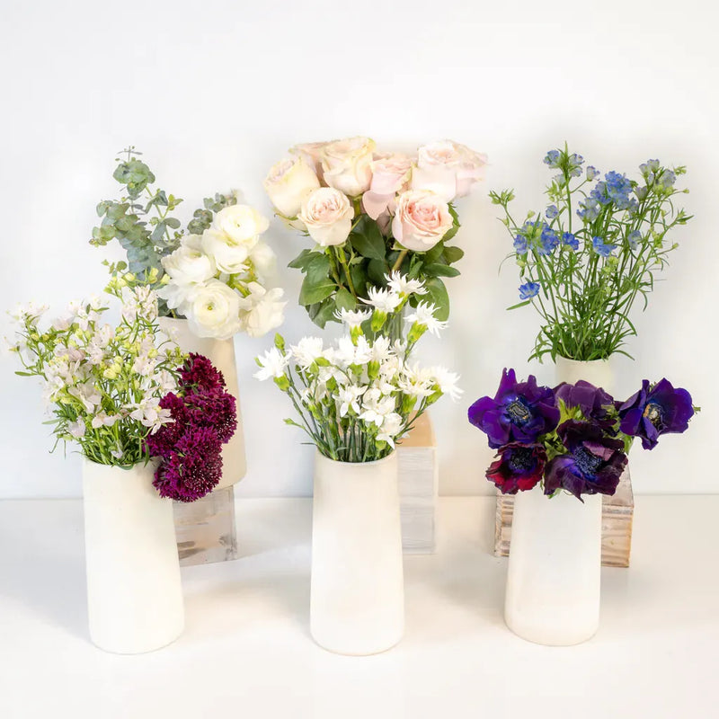 This DIY Flower Kit features growers bunches of Pink Mondial Roses, Bicolor Pompei Roses, Burgundy Scabiosa, Burgundy Anemone, White Ranunculus, White Solomio, Pink & Blue Delphinium, and Baby Blue Eucalyptus.