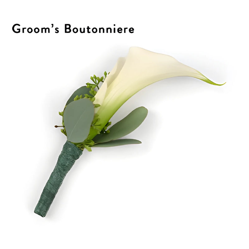 - Groom's Boutonniere features: White calla lily and seeded eucalyptus*.