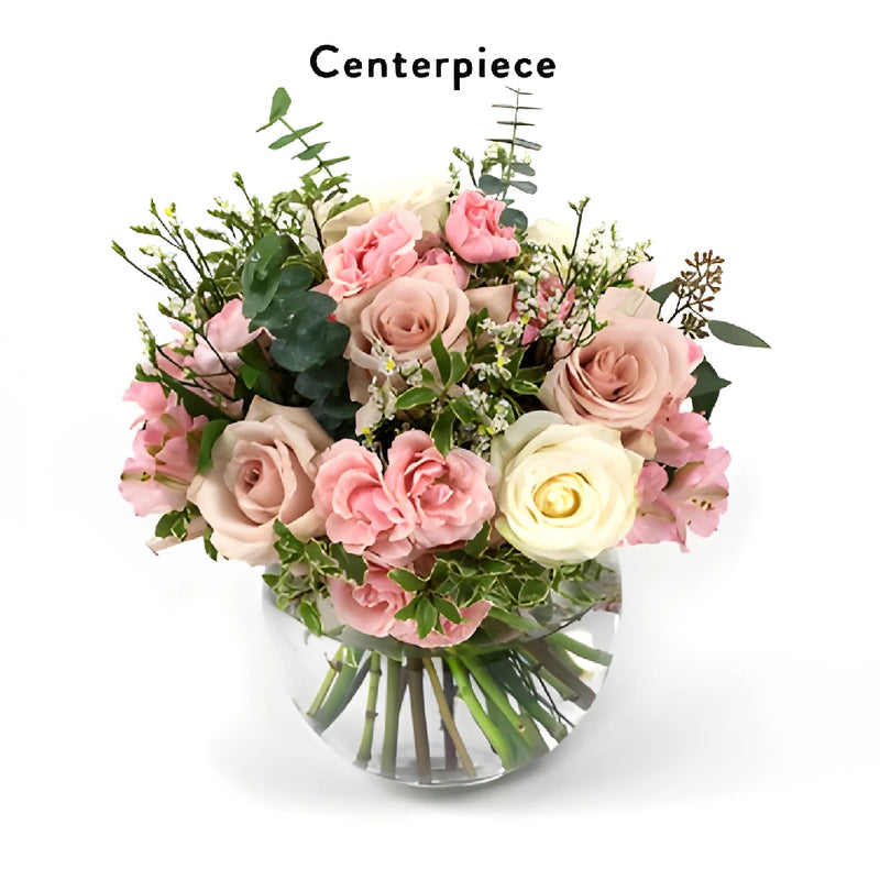 - Centerpieces feature: Mondial cream roses, Quick Sand roses, spray roses, blush alstroemerias, pale pink mini carnations, white limonium, seeded eucalyptus*, baby eucalyptus, and mini variegated pittosporum.