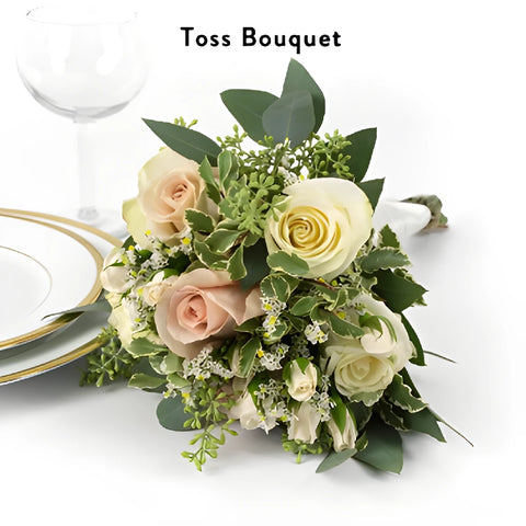 - Toss Bouquet features: Mondial cream roses, Quick Sand roses, spray roses, white limonium, seeded eucalyptus*, and mini variegated pittosporum.