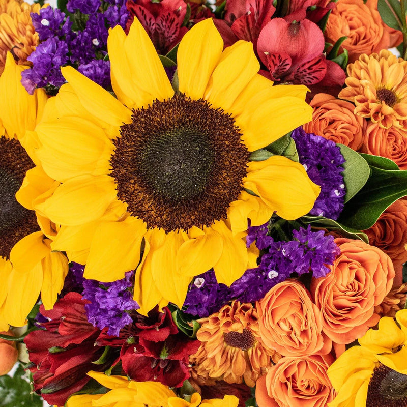 Each bouquet features a harmoniously hand-crafted arrangement of red alstroemeria, purple matsumoto, yellow sunflowers, purple statice, orange spray roses, orange viking poms, pittosporum, leather leaf, and parvifolia eucalyptus.