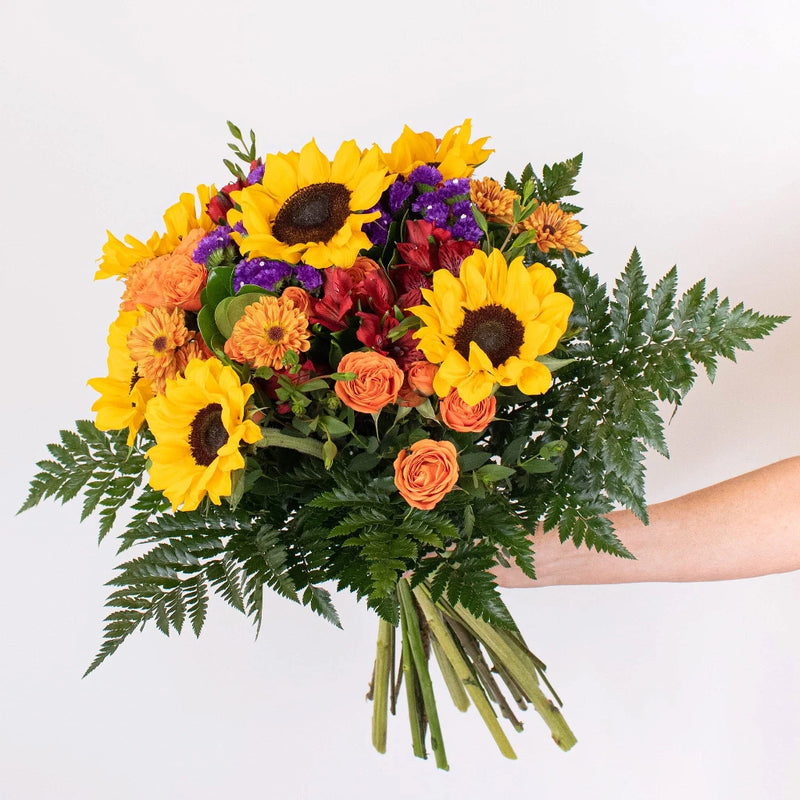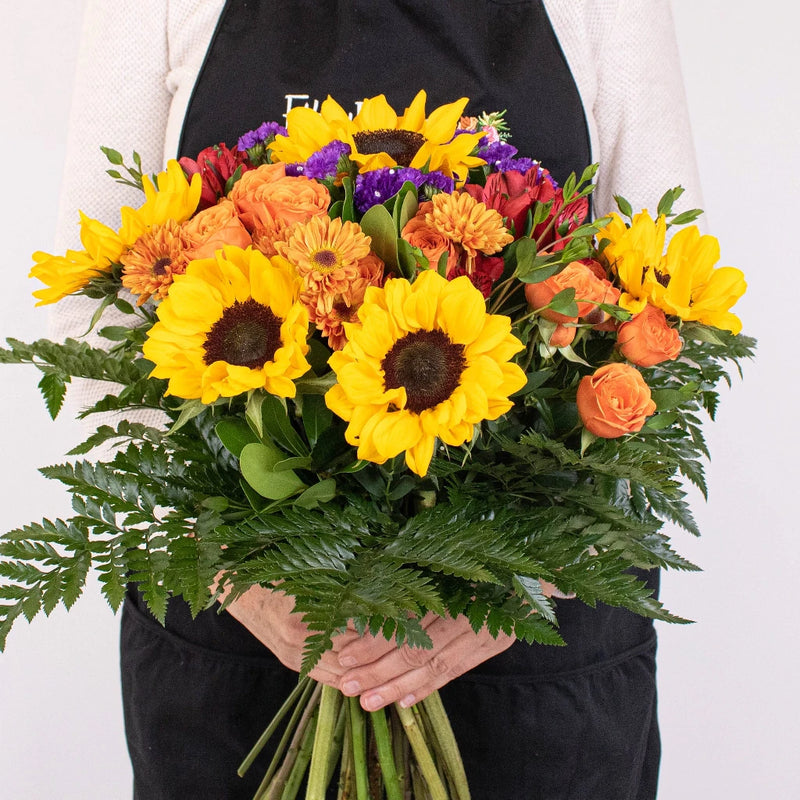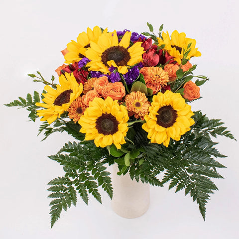 For those of us who long for that summer warmth all year long, this bouquet is for you! Bright yellow sunflowers steal the show, and orange poms and purple statice make this flower arrangement complete. These flowers will ship pre-arranged – decorating for fall has never been so easy! All you have to do is pop them in a vase and let their sunshine warm up your home.