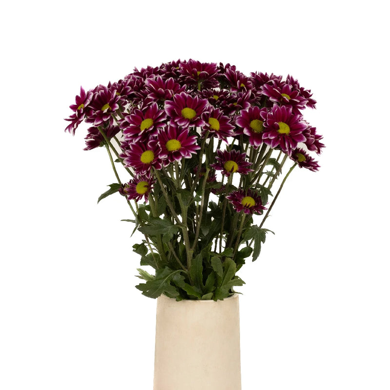 Our striking Fading Purpleberry flowers add punch to a classic daisy-like design. Each sturdy stem has 4-5 blooms featuring petals in a rich berry purple that blend to a fringe of white at the tips, with a domed center in yellow. Pair with complimenting flowers such as lavender roses and pink gerbera daisies with green hypericum berries for texture, or as a pop of color nestled among FiftyFlowers' white Dahlia-style Cremon Snowflake flowers for a long-lasting arrangement.
