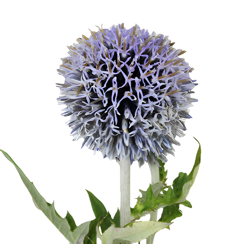 The steel blue spherical shape of the Globe Thistle Ecnichops Wholesale Flowers adds dimension and a wow factor to any floral arrangement. The spiny leaf thistle flower adds beautiful juxtaposition when mixed with hues of yellow like Craspedia Billy Balls, Bulk Tulips, and Viva Yellow Roses.
