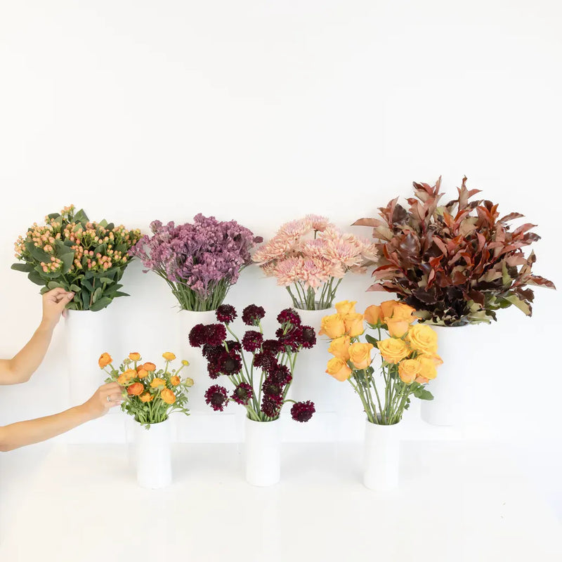 This Flower Bar Kit features growers bunches of cremon, orange rose, tinted mauve statice, peach hypericum, burgundy scabiosa, orange ranunculus, and red greenery.