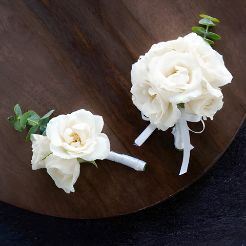 - Each Pin-on Corsage Features: 2 Ivory Spray Roses paired with a sprig of Baby Eucalyptus greenery and wrapped with a white ribbon. White headed pins included.