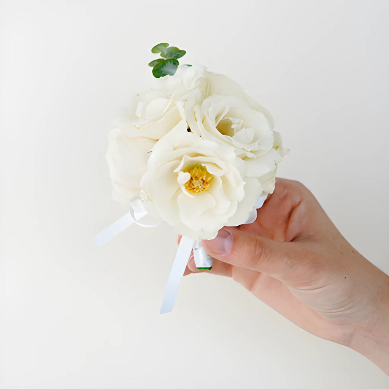 - Each Wrist Corsage Features: 2 Ivory Spray Roses paired with a sprig of Baby Eucalyptus greenery, wrapped with a white ribbon and attached to a wristlet.
