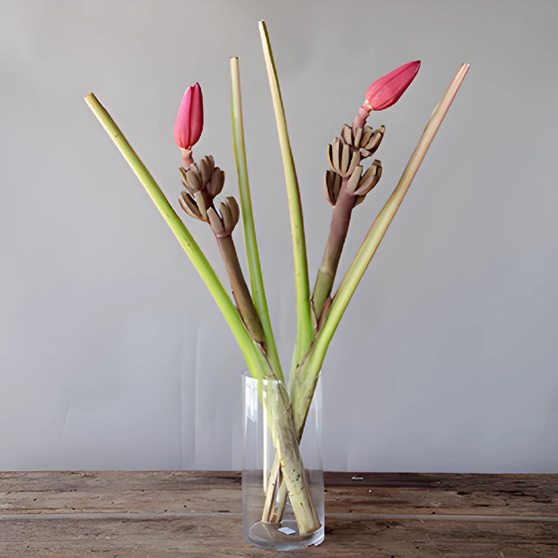 Monitor Water Levels: Tropical flowers drink heavily upon arrival, so check frequently to ensure all stems are always submerged. If the water drops below the stems, refill immediately and recut them before placing them back in the container.