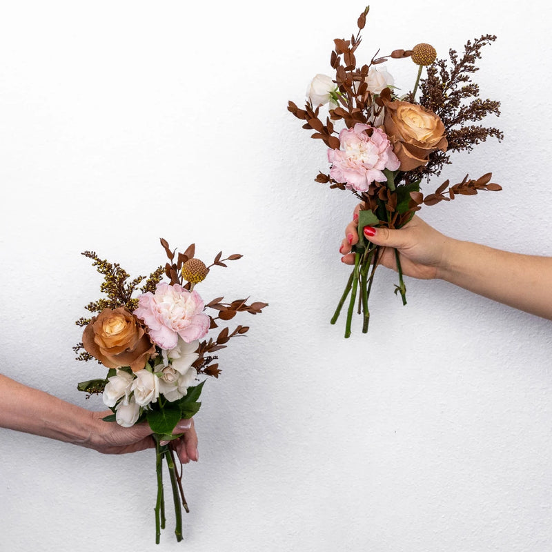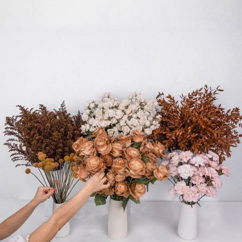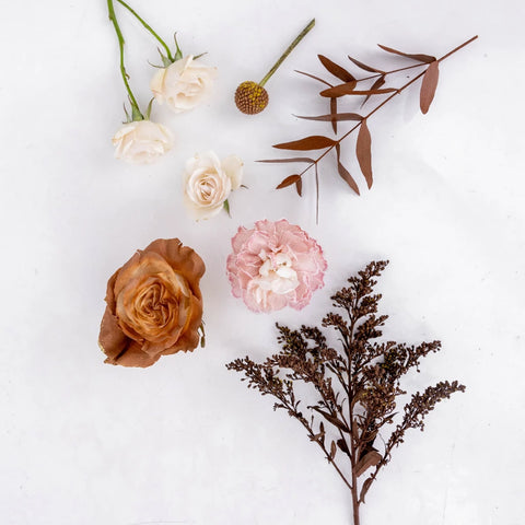 Suggested Flower Recipe For One Bouquet: 1 tinted brown rose, 1 tinted beige carnation, 1 tinted brown solidago, 1 cream spray rose, 1 tinted brown parvifolia, and 1 tinted brown billy ball.