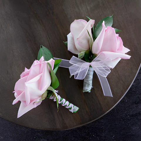 • Each Pin-on Corsage Features: 2 Light Pink Roses adorned with Israeli Ruscus, wrapped with a pink tulle ribbon.White headed pins included.