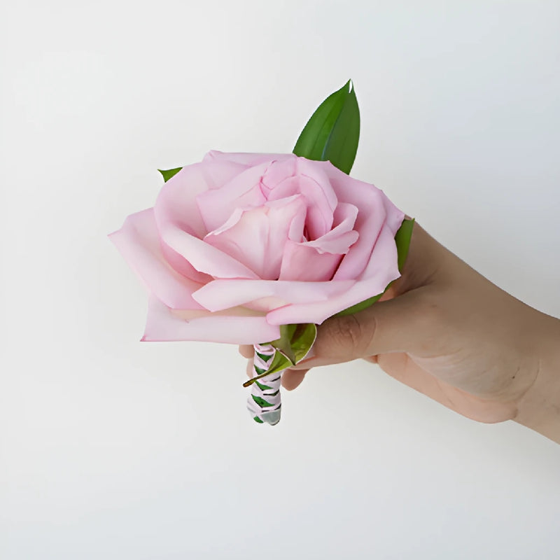 • Each Boutonniere Features: 1 Light Pink Rose adorned with Israeli Ruscus, wrapped with a pink ribbon. White headed pins included.