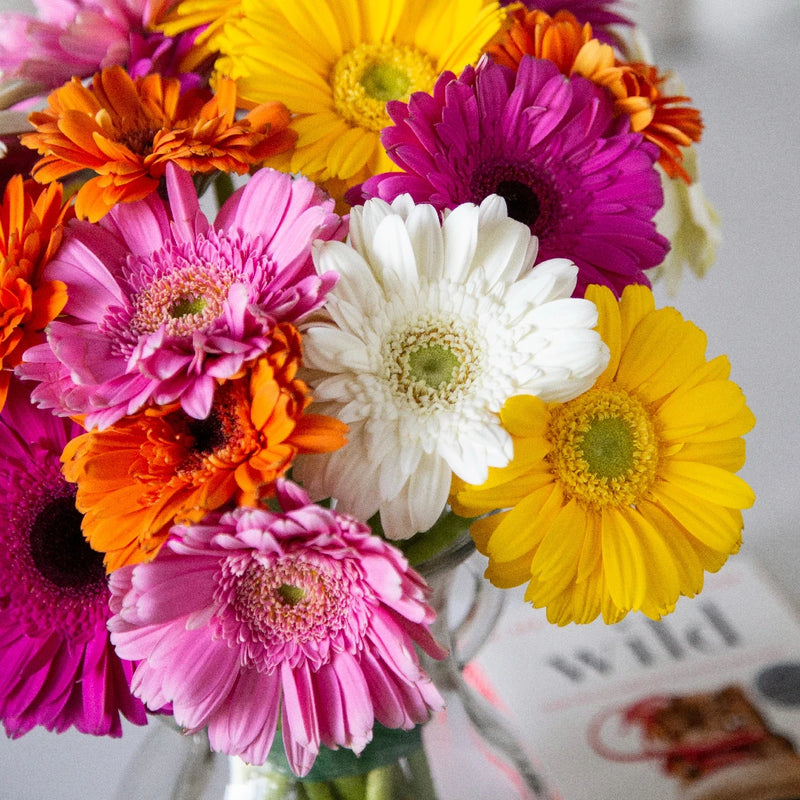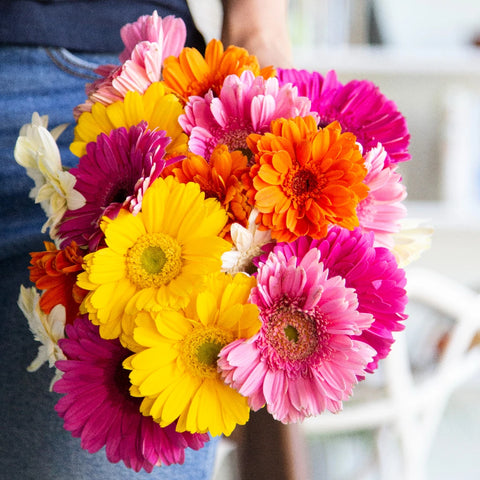 Gerberas are highly sensitive to stem blockages and bacterial buildup. To prevent this, place stems in shallow water and monitor levels closely. For optimal support and hydration, use a chicken wire grid across the top of your bucket to dangle the stems without letting them rest on the bottom. Alternatively, create a taped grid over your bucket or vase.